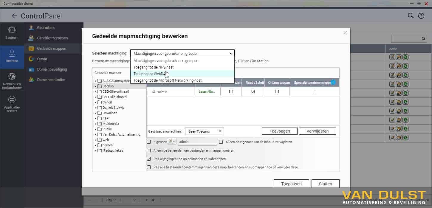Selecteer dan in het nieuwe venster “Gedeelde map machtiging bewerken” bij Selecteer machtiging: voor “Toegang tot WebDAV“