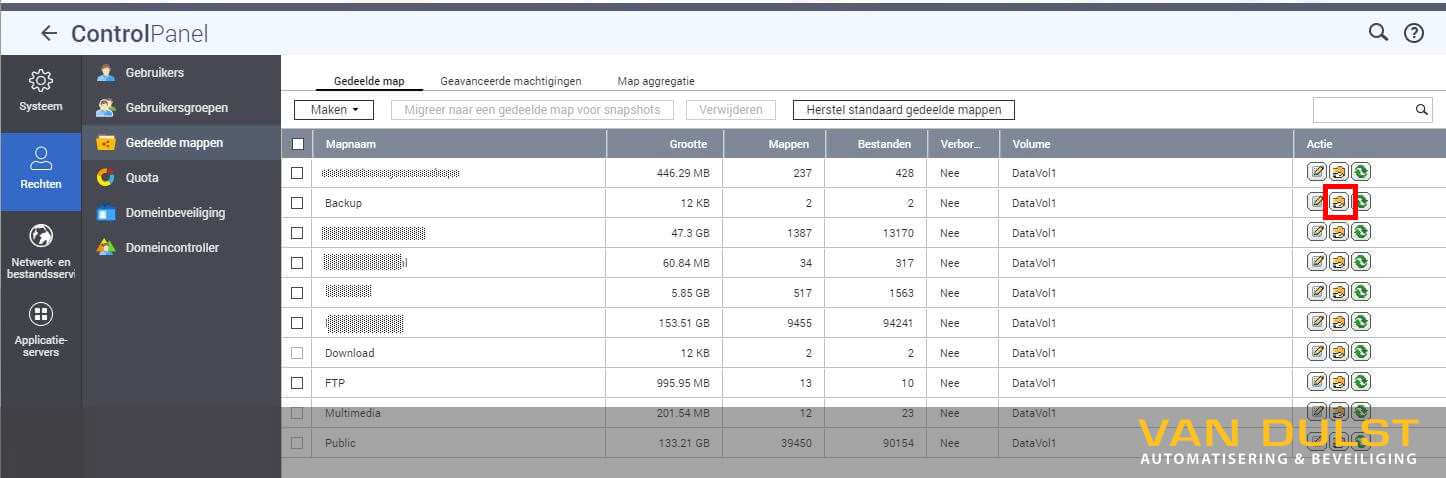 Je kunt de toegangsrechten instellen via Configuratiescherm –> Gedeelde mappen –> en dan op de gele map achter de map te klikken.